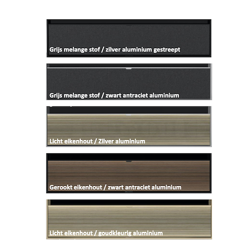 Welke frontcover kiest u? Grijs doek met Zilver, Grijs doek met Zwart Antraciet, Licht Eikenhout met Zilver, Gerookt Eikenhout met Zwart Antraciet, Licht Eikenhout met Goud