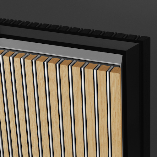 De houten luidsprekercovers zijn een voorbeeld van goed vakmanschap en passen uitstekend bij het donkere tv-scherm dankzij de huiselijke materialen die vaak voor interieurs worden gebruikt en die een warme uitstraling creëren met elegante details:
